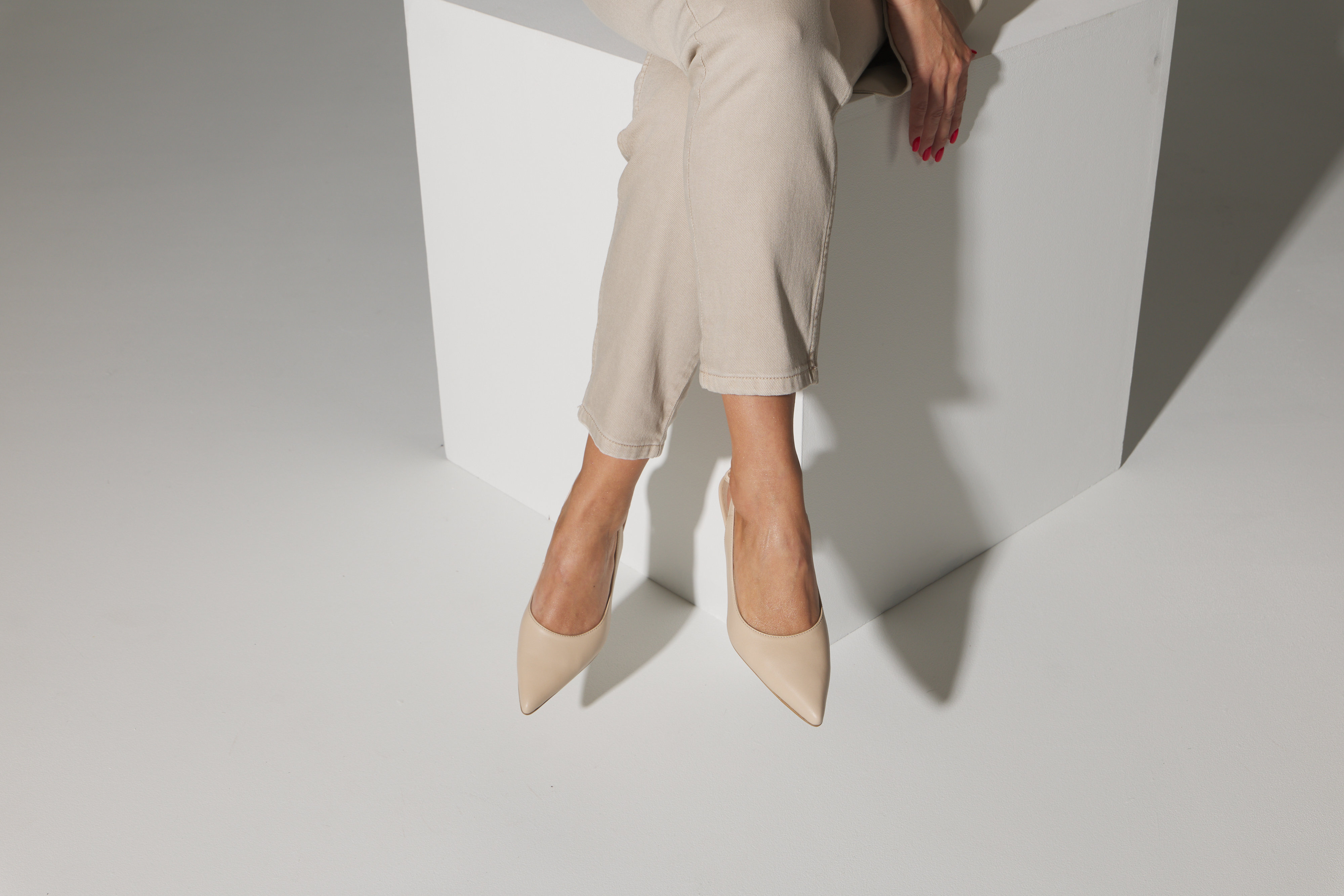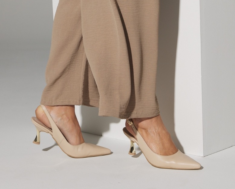 Klasyczne, beżowe czółenka wykonane z naturalnej skóry, które łączą elegancję z wygodą bez kompromisów. Smukły nosek pięknie wydłuża stopę, a odkryta pięta z regulowanym paskiem i złotą klamerką dodaje lekkości i subtelnej kobiecości.